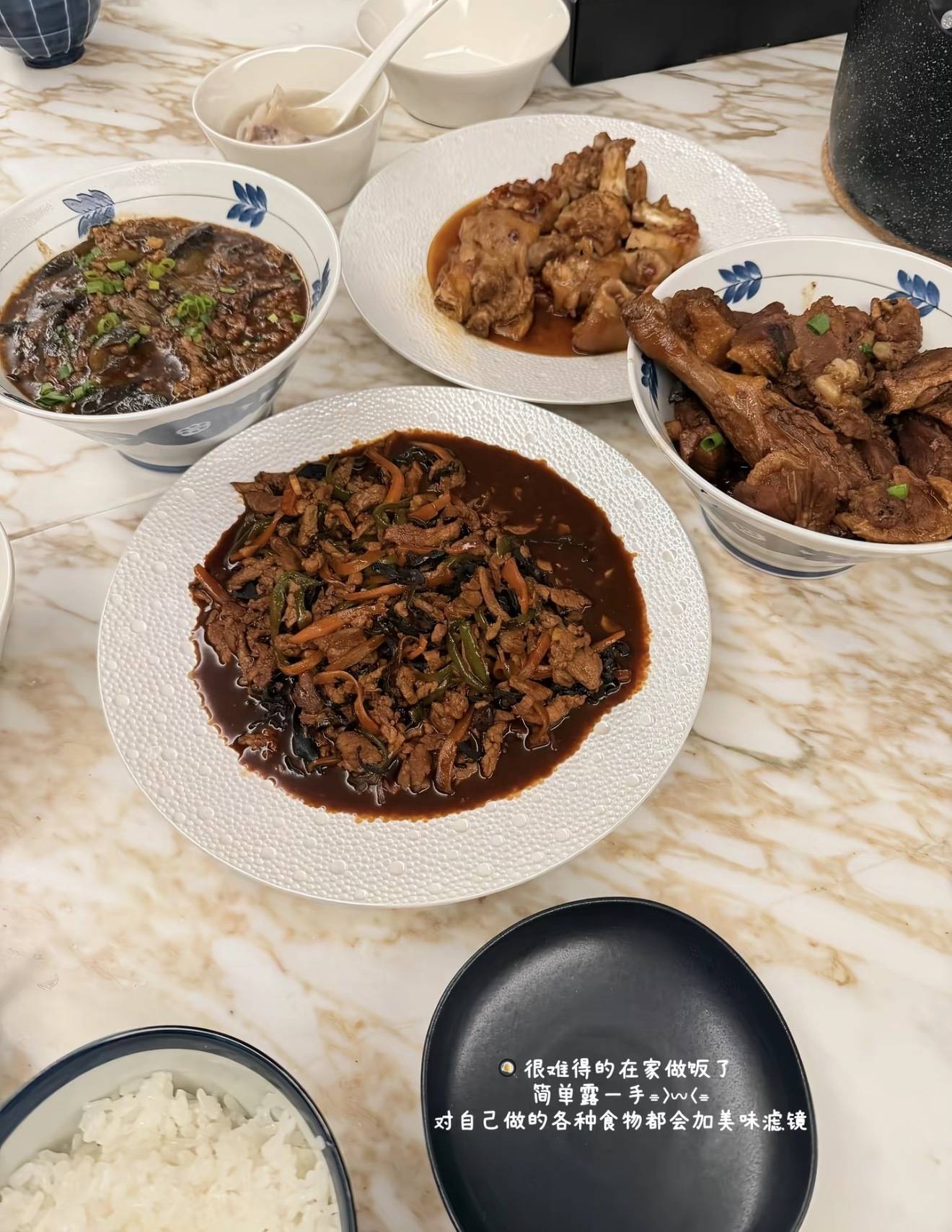两人没事时还会在家里下厨,四菜一汤看着很有食欲。